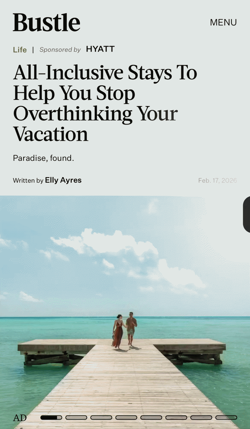 For Hyatt’s Inclusive Collection campaign, Elly wrote interactive card stories for Bustle and Scary Mommy highlighting all-inclusive resorts across the portfolio. The articless translated resort highlights into easy vacation inspiration — helping readers picture their next trip, from laid-back couples’ getaways to family vacations that practically plan themselves.